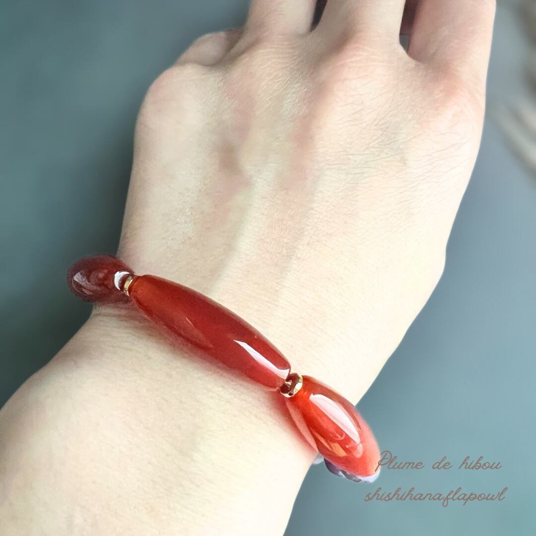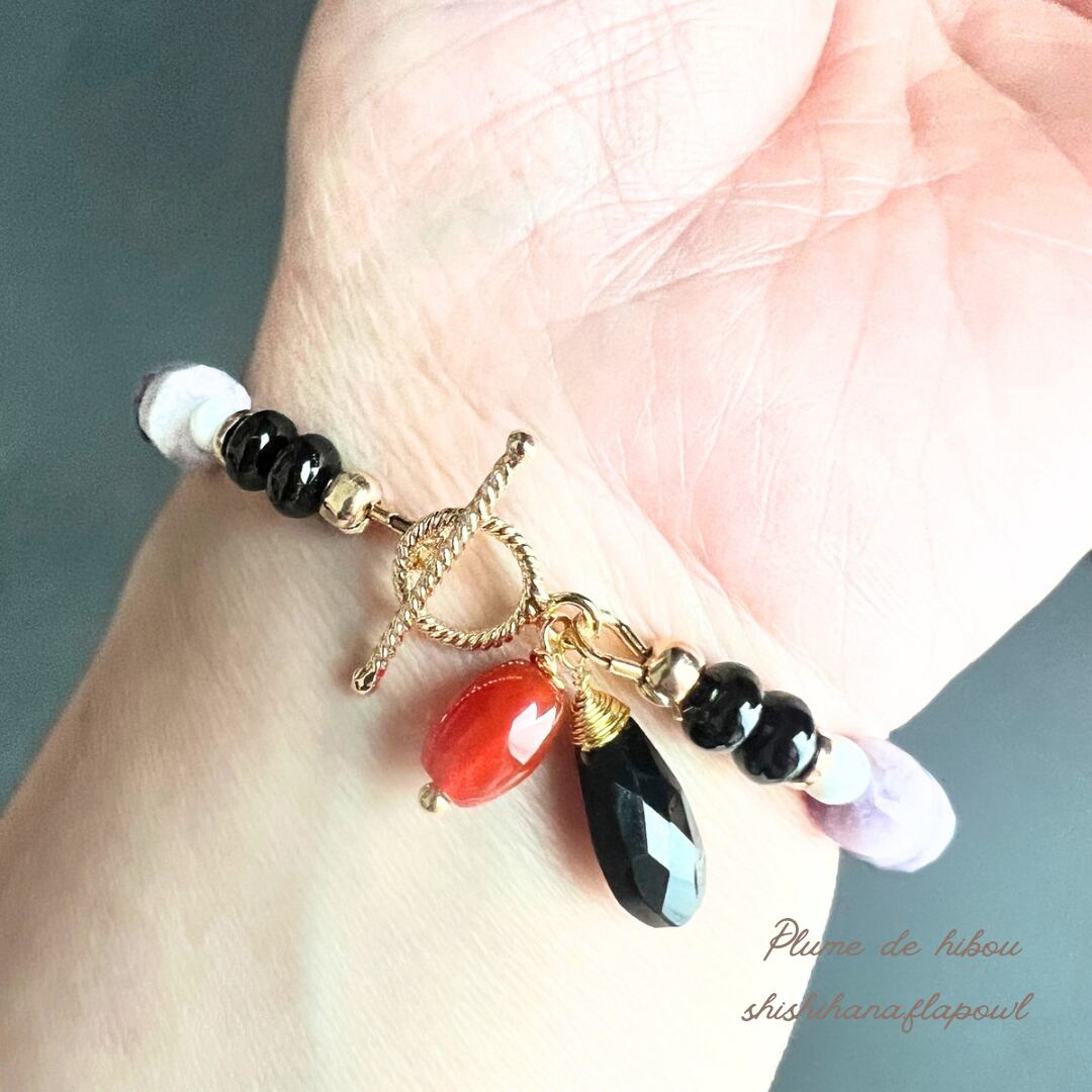 鮮やかな朱赤メノウ、優雅なティファニーストーン、そしてクールなブラックスピネルを贅沢に使用したこのブレスレットは、あなたのスタイルを一層引き立てる個性的なアイテムです。