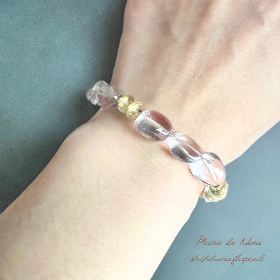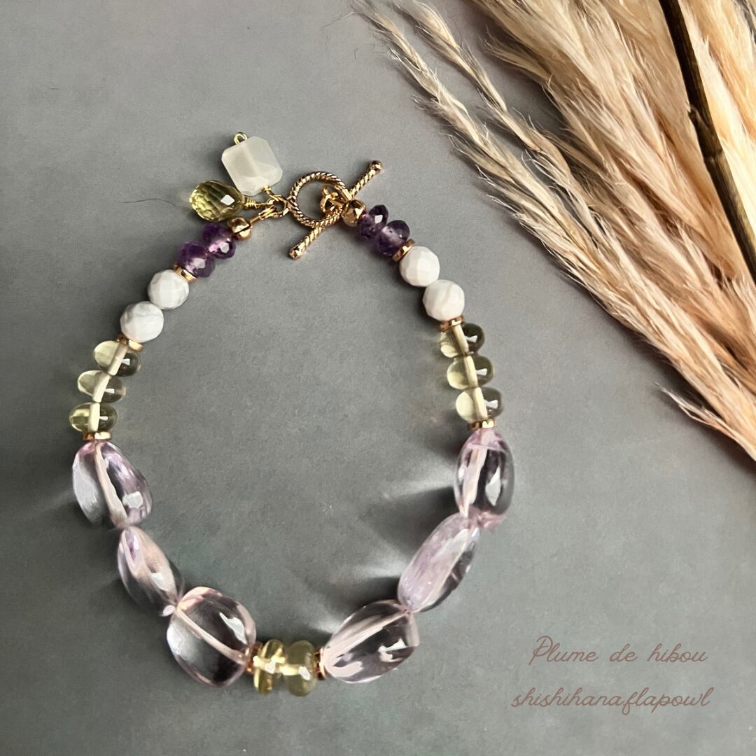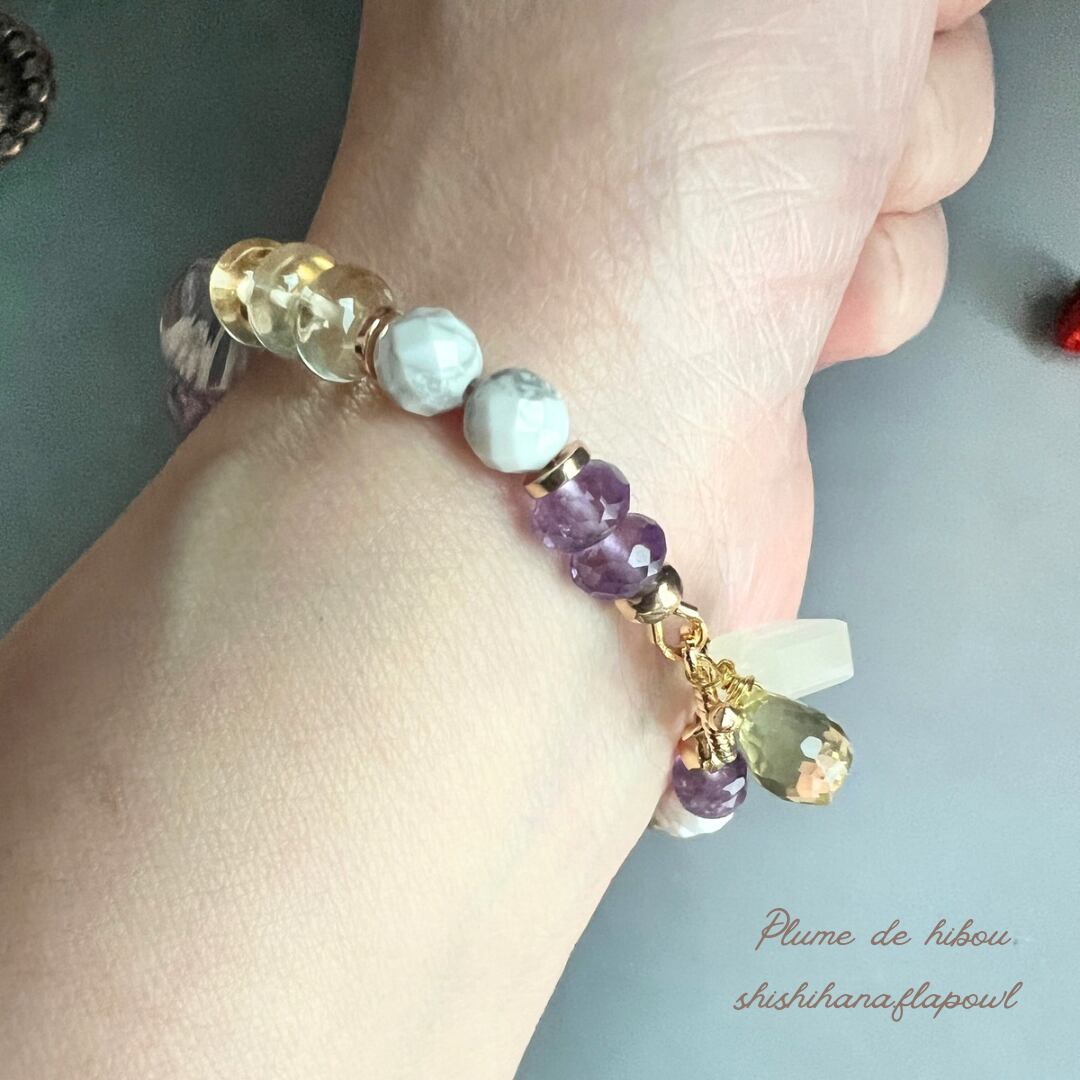 神秘的なアメジストスムース、爽やかなレモンクオーツ、そして優しいハウライトを贅沢に使用したこのブレスレットは、大人コーディネートを一層引き立てる魅力的なアイテムです。