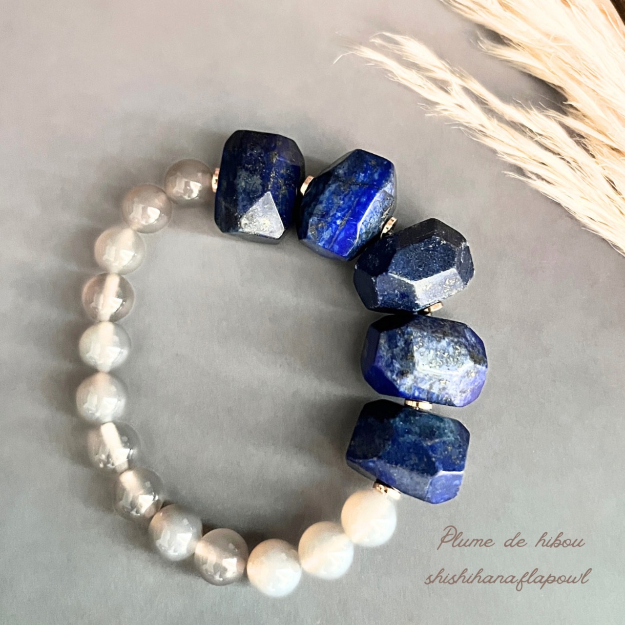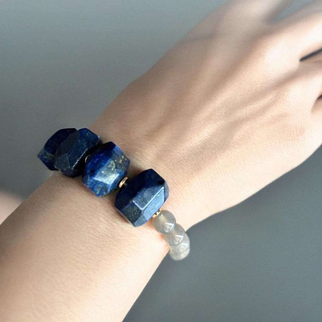 神秘的な深い青色のラピスラズリと、やさしいグレージュカラーのアゲードを贅沢に使用したこのブレスレットは、あなたのスタイルを一層引き立てる魅力的なアイテムです。